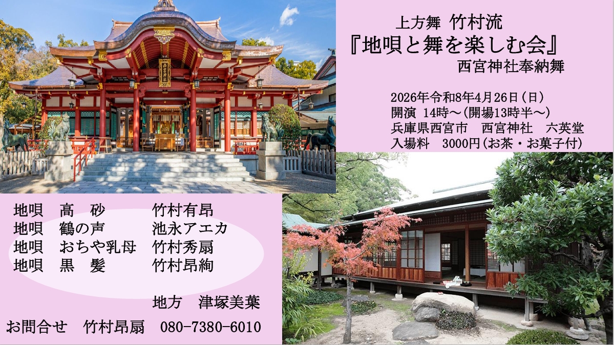 【お知らせ】イベント「4/26(日)※西宮神社奉納舞※地唄と舞を楽しむ会」チラシを掲載しました
